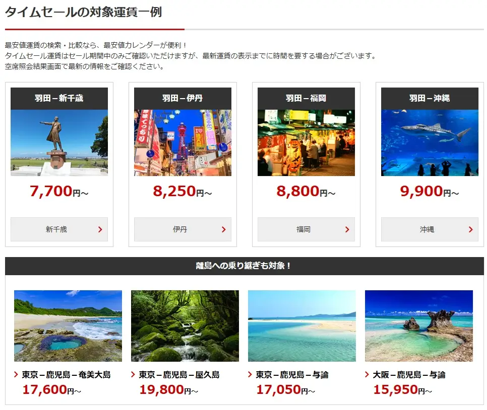 人気のJALタイムセール運賃は、時期によって特定の場所、曜日、日程に集中しがちです。